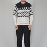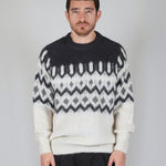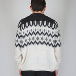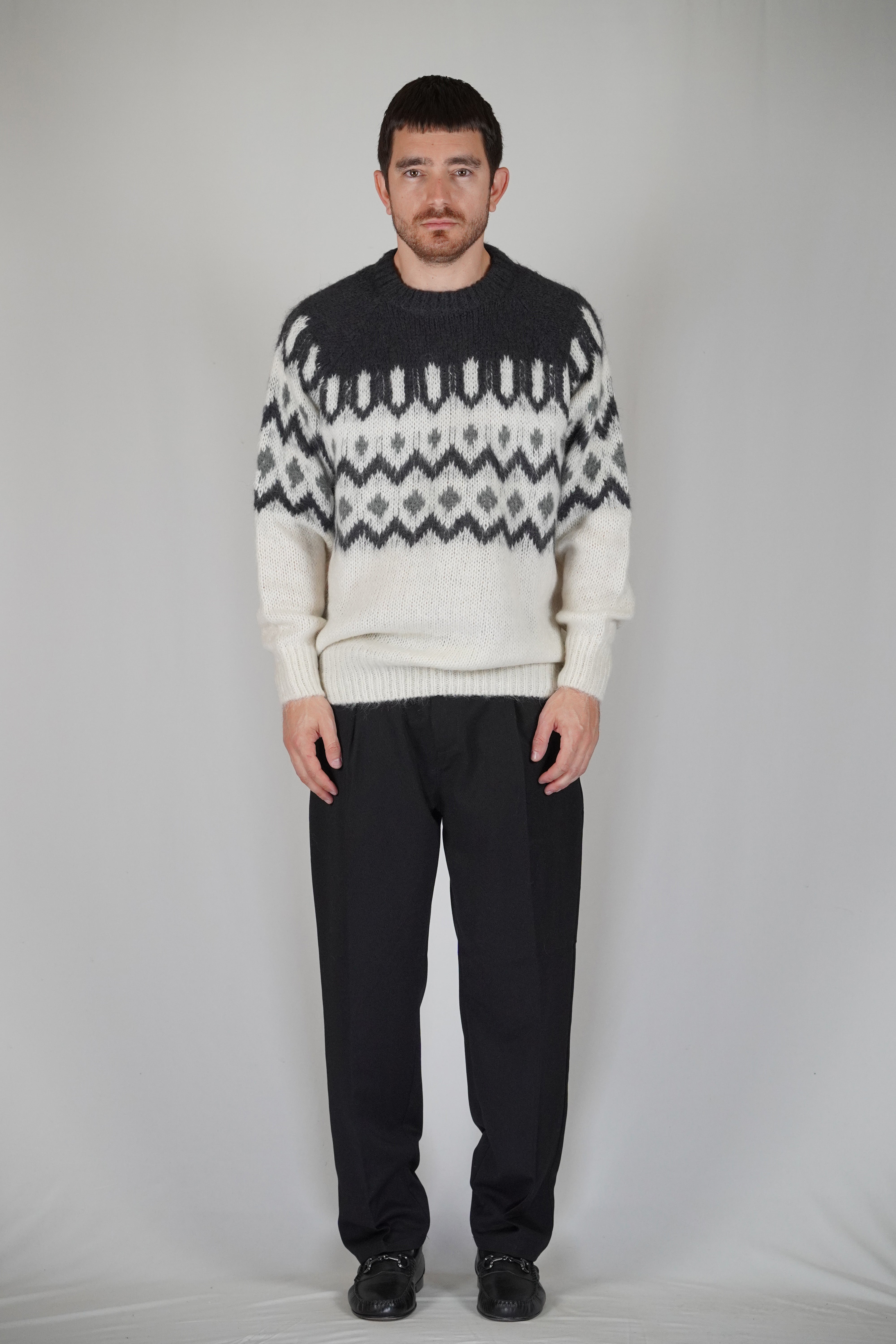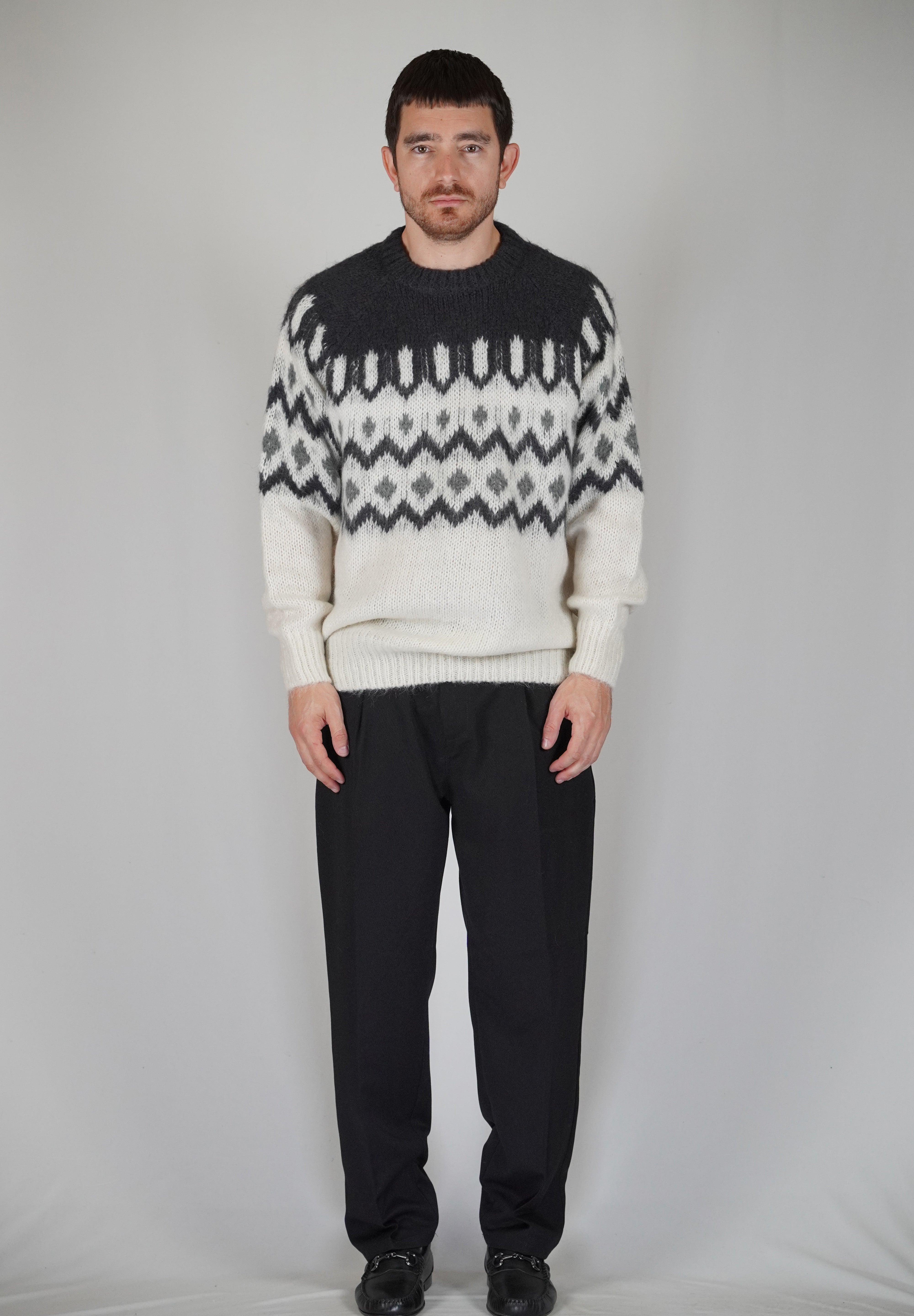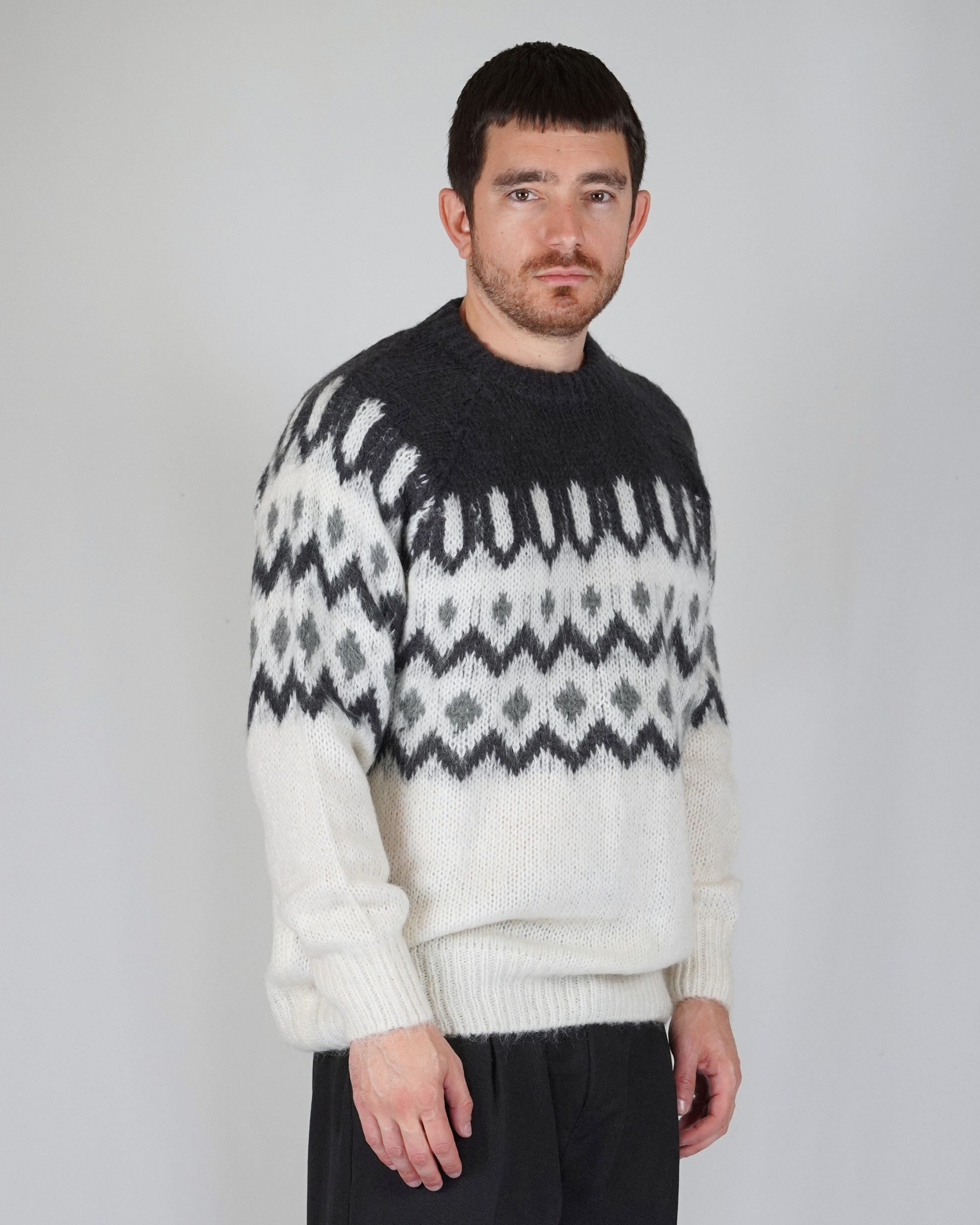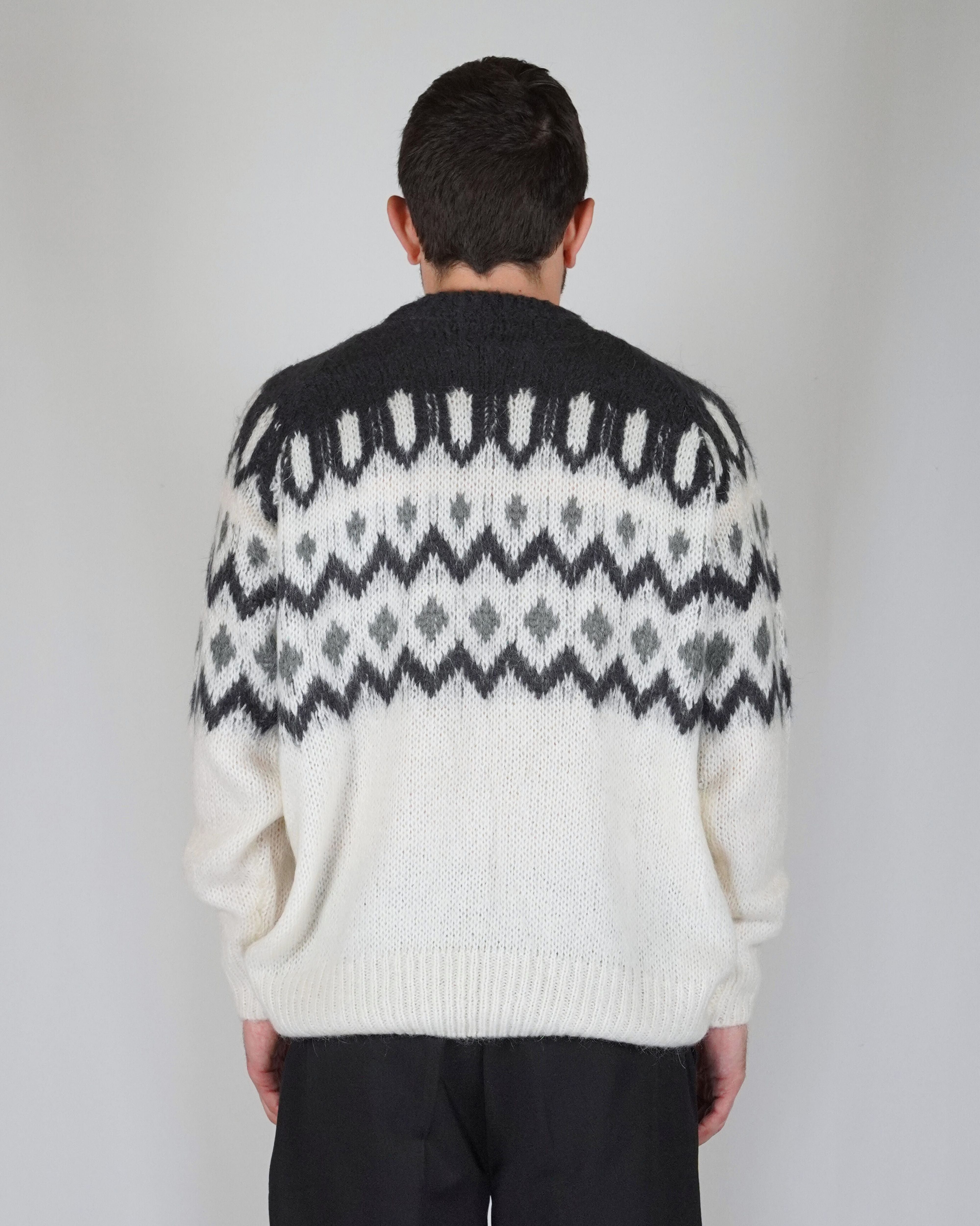 La fantasia origami compone la trama del capo. Il bianco alla base gli conferisce luce ed armonia. Diverse tonalità di grigio compongono i dettagli del disegno che assieme al mohair regala morbidezza ed eleganza.